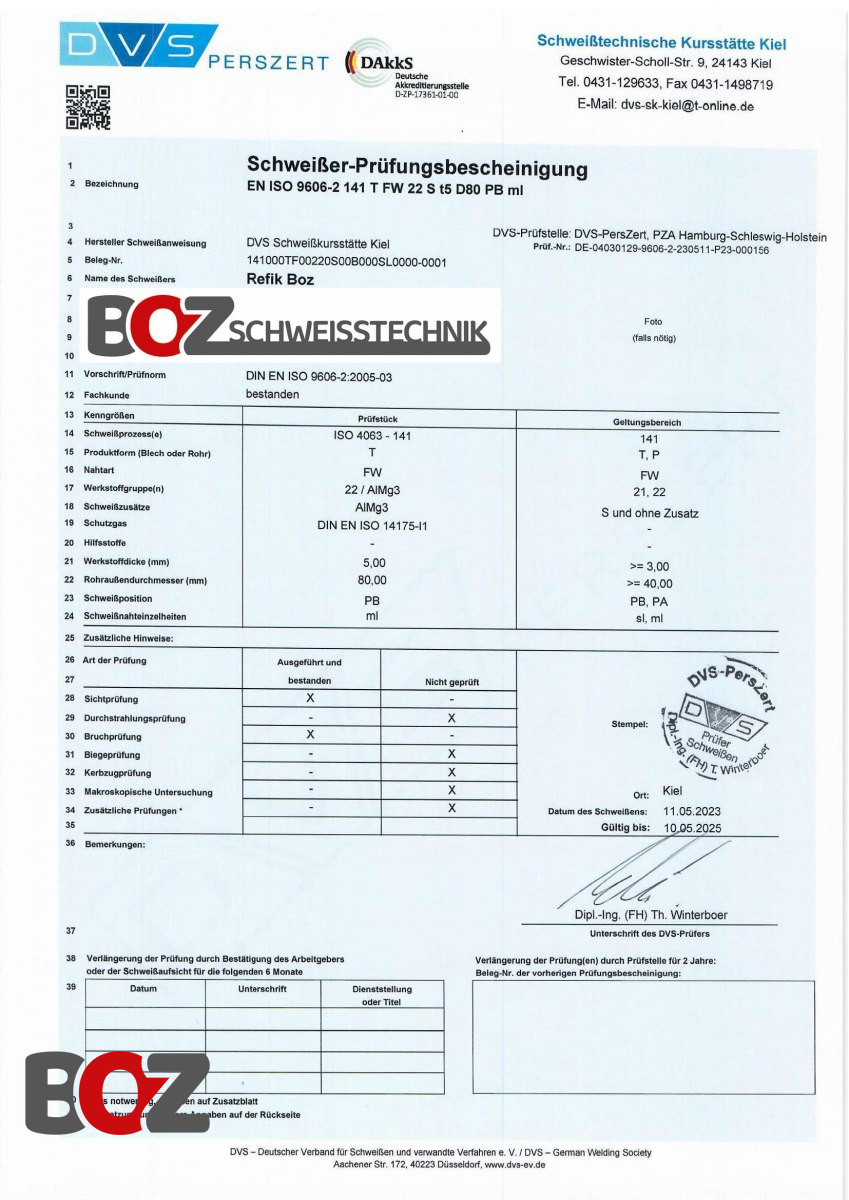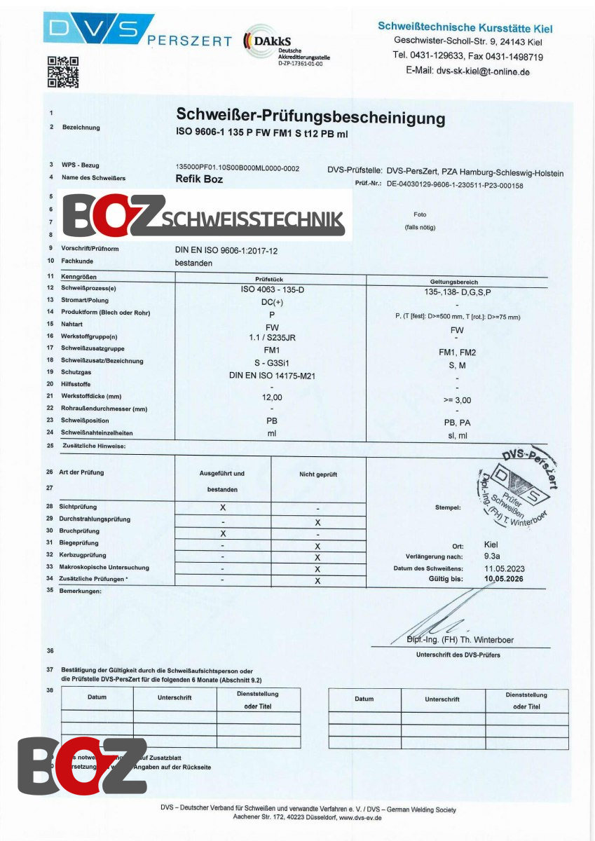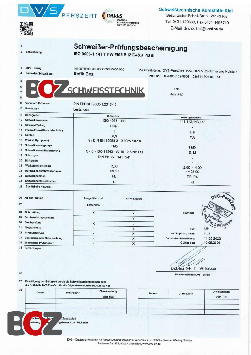 Mein Name ist Refik Boz und ich bin seit mehr als 35 Jahren als zertifizierter Schweißer und Konstruktionsmechaniker tätig.Meine aktuellen Schweißerprüfungen können Sie unten entnehmen.