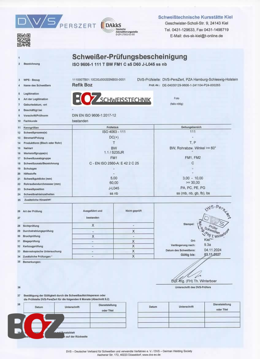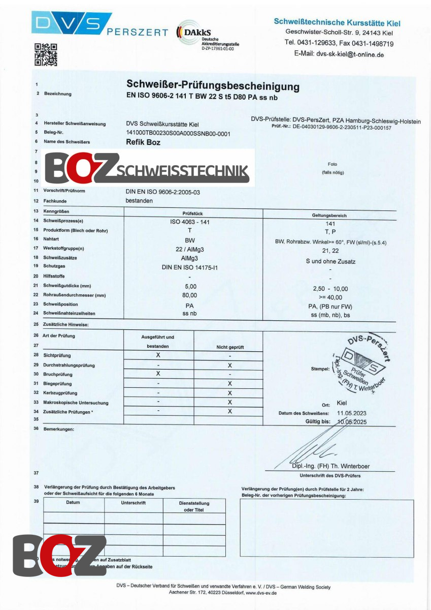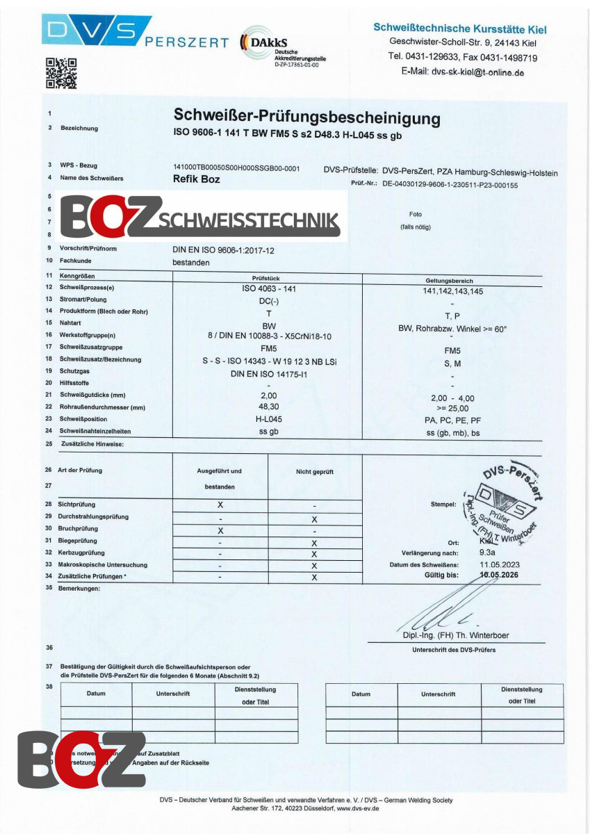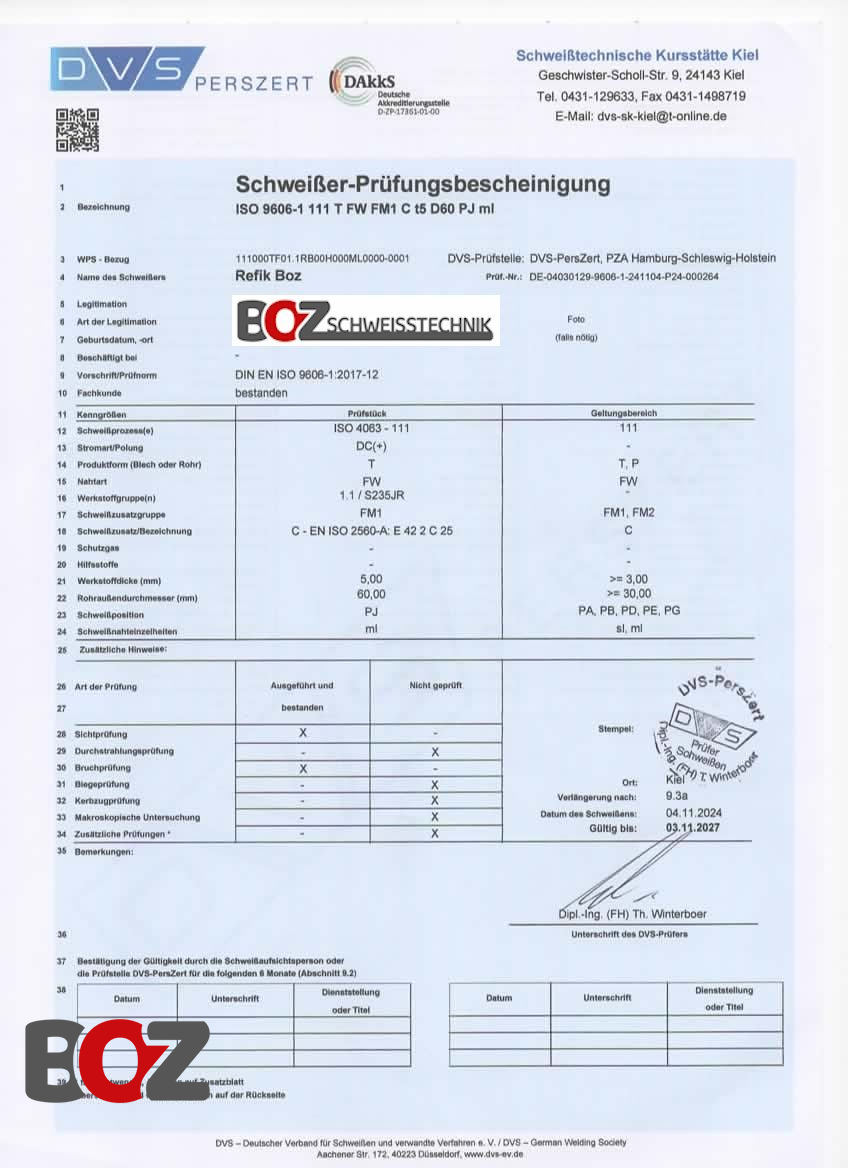 Mein Name ist Refik Boz und ich bin seit mehr als 35 Jahren als zertifizierter Schweißer und Konstruktionsmechaniker tätig.Meine aktuellen Schweißerprüfungen können Sie unten entnehmen.